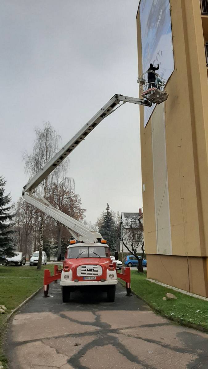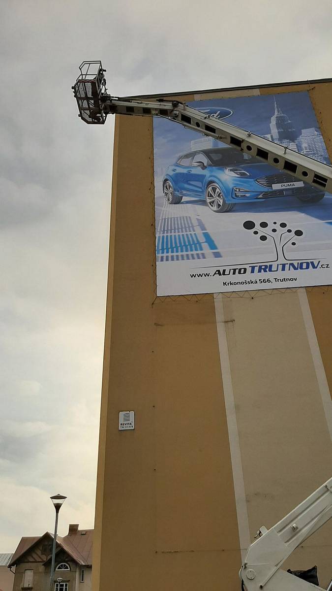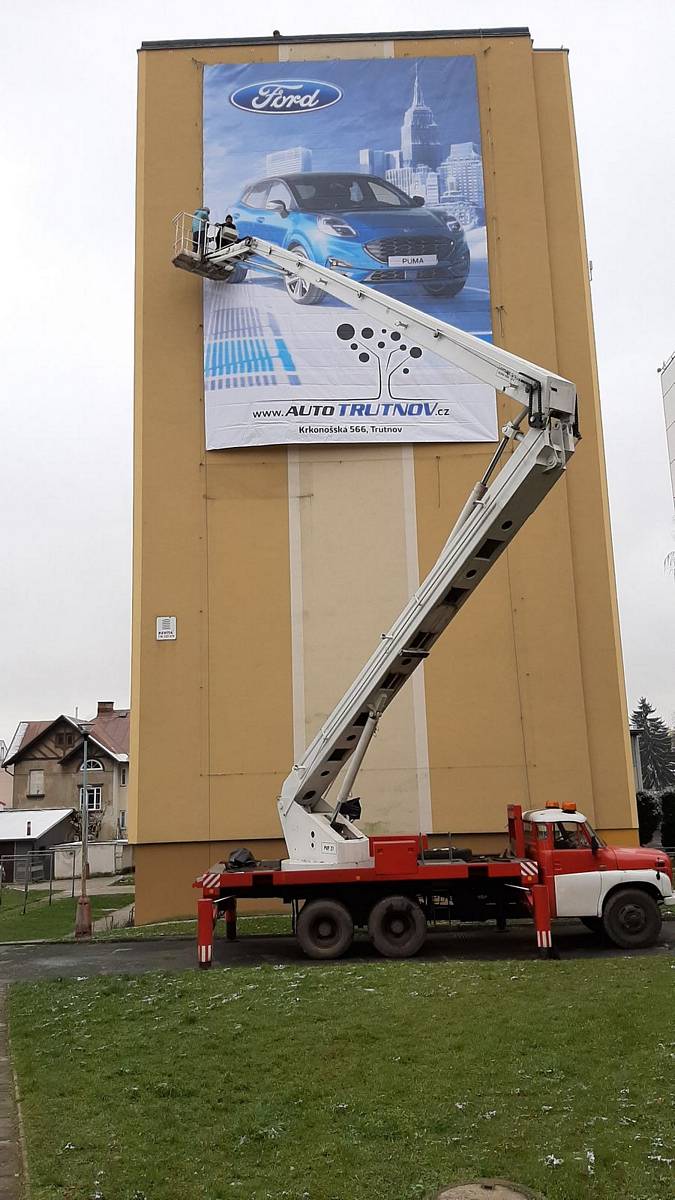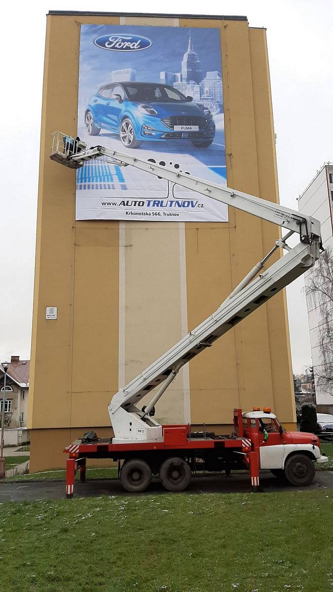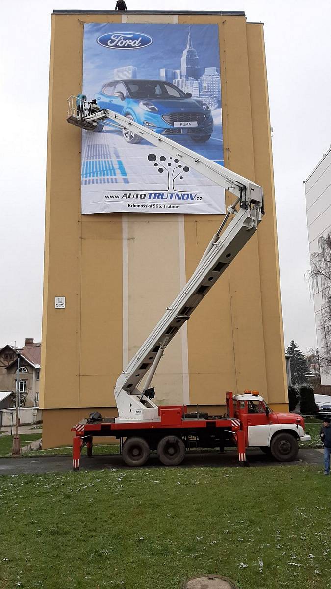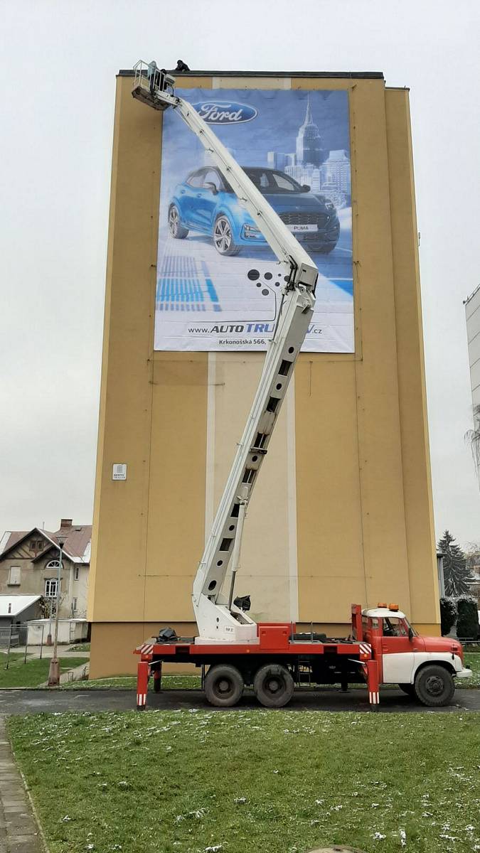 Montáž reklamní plachty z autoplošiny na panelák ve Vrchlabí