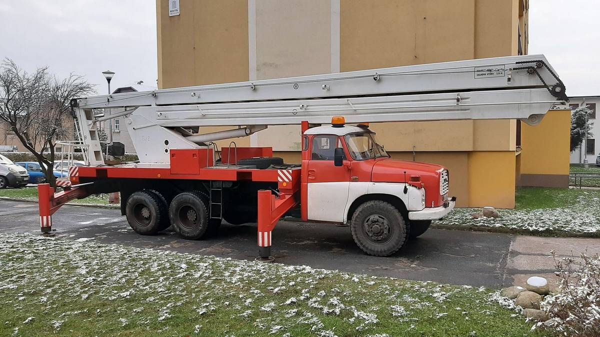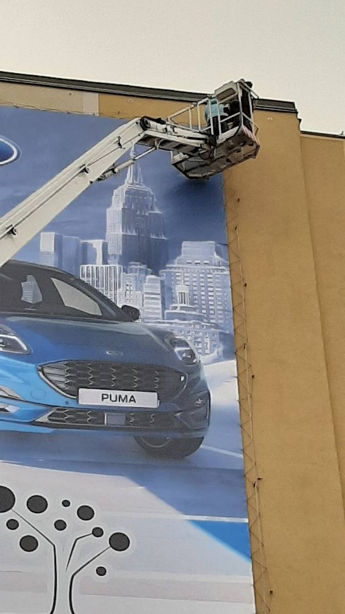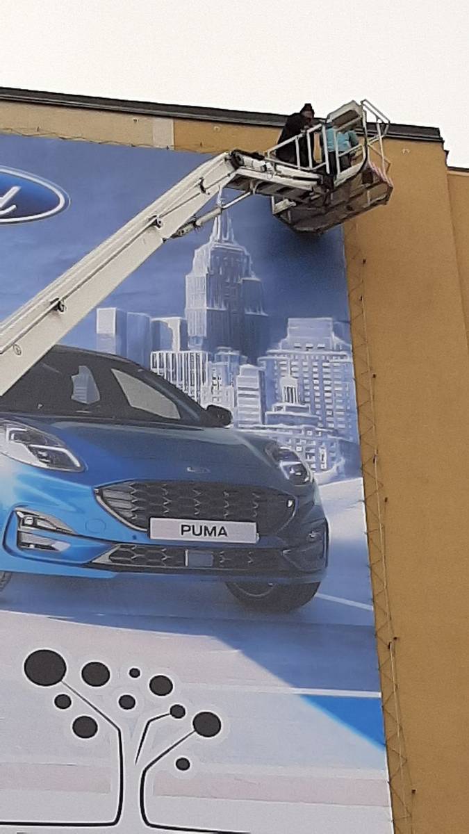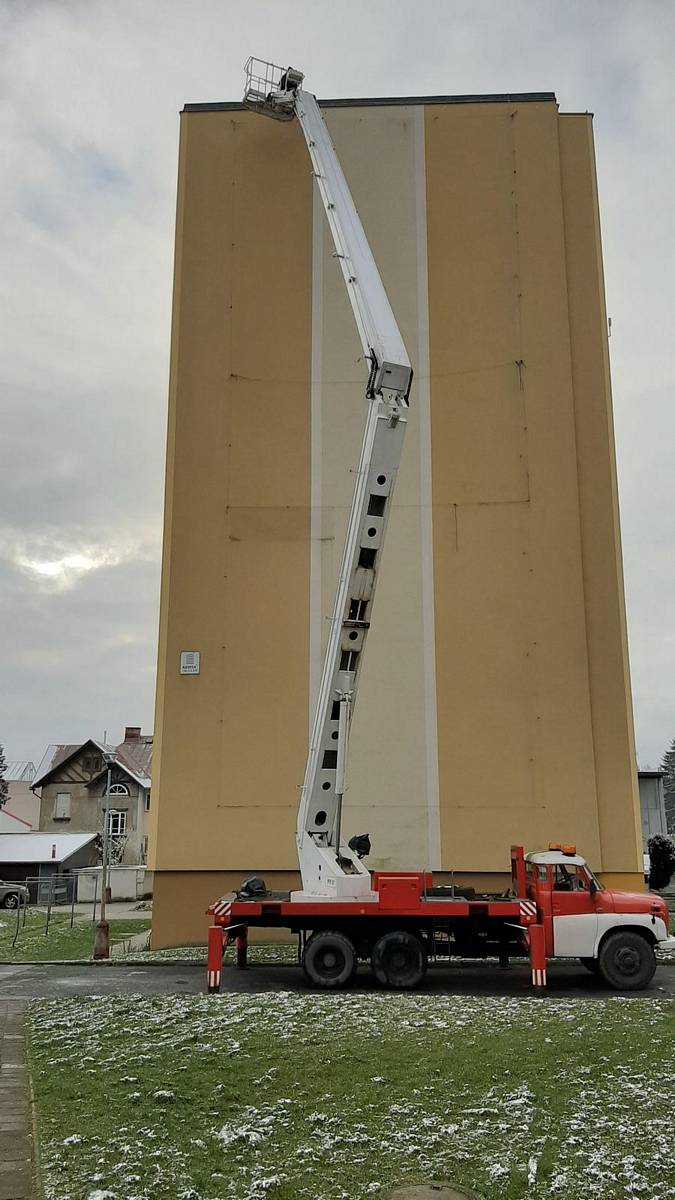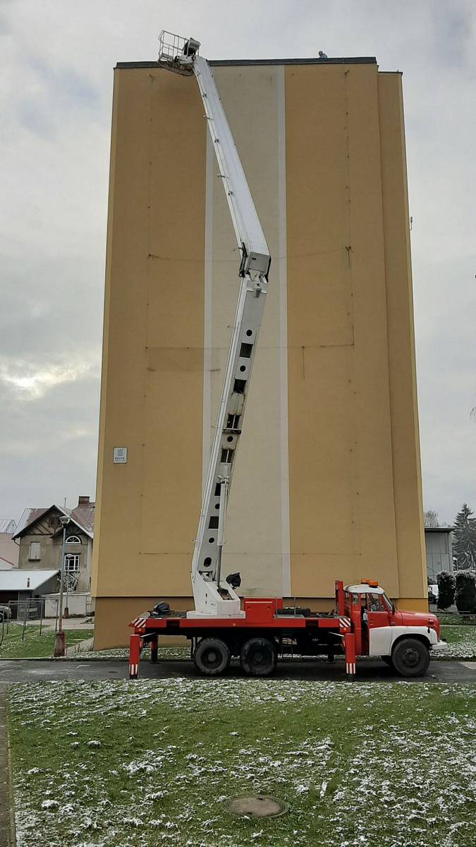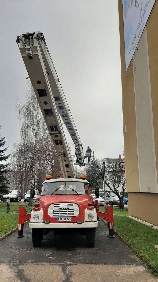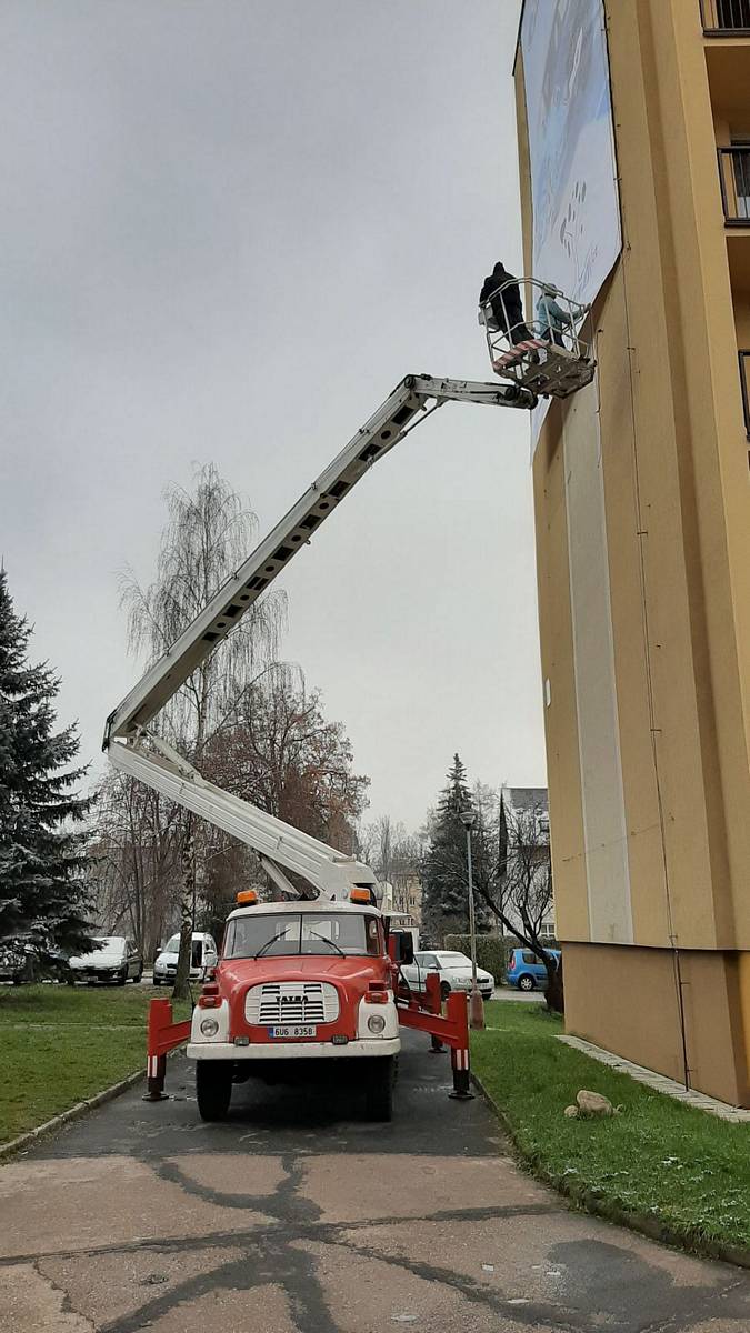 Montáž reklamní plachty z autoplošiny na panelák ve Vrchlabí